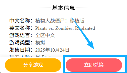 3.搜索到游戏后,点击游戏图标,进入游戏详情,点击右下角的兑换按钮: